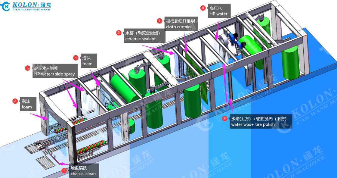 * Máy có 13 bàn chải, 2 bàn chải trên cùng, 6 bàn chải bên và 5 bàn chải bánh có thể rửa xe hoàn toàn.